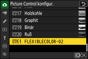 Auf Speicherkarten exportierte Picture-Control-Konfigurationen werden der Picture-Control-Liste hinzugefügt, wenn sie mittels [Picture Control verwalten] im Fotoaufnahmemenü oder Videoaufnahmemenü in die Kamera importiert werden.