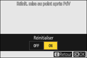 Vous pouvez désormais sélectionner [Réinit. mise au point après PdV] en appuyant sur la commande DISP dans la boîte de dialogue de confirmation des réglages avant de démarrer la prise de vue automatique. Cela vous permet de définir si la position de mise au point (distance de mise au point) est réinitialisée lorsque l’appareil photo entre en mode veille pendant la prise de vue automatique.