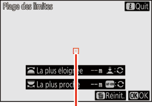 Positionnez le point AF sur un sujet situé à la distance la plus éloignée et appuyez sur le déclencheur à mi-course pour définir la distance maximale. Tournez la molette de commande secondaire ou maintenez appuyé le déclencheur à mi-course tout en tournant la bague de mise au point de l’objectif pour affiner la distance maximale.