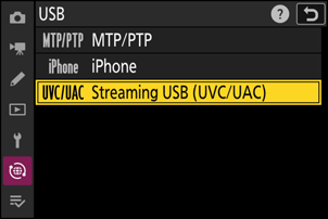 Appareil photo : sélectionnez [USB] dans le menu Réseau, mettez en surbrillance [Streaming USB (UVC/UAC)] et appuyez sur J.
