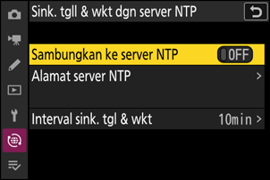 | [Sambungkan ke server NTP] | Memilih [ON] menyambungkan kamera ke server NTP dan mensinkronkan tanggal dan waktunya. |