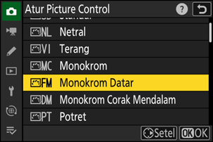 - [Monokrom Datar] dan [Monokrom Corak Mendalam] juga telah ditambahkan ke Picture Control asli pada mana Picture Control kustom didasarkan [Kelola Picture Control] di menu pemotretan foto dan perekaman film.