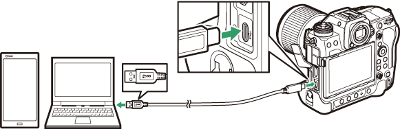Sambungkan kamera dan komputer/perangkat pintar menggunakan kabel USB (USB Cable) disertakan.