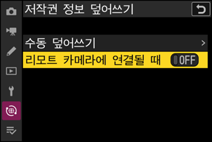 리모트 카메라를 마스터 카메라에 연결하면 마스터 카메라에 저장된 저작권 정보로 리모트 카메라의 저작권 정보를 자동으로 덮어씁니다. 덮어쓰기를 활성화하려면 마스터 카메라의 네트워크 메뉴에서 [다른 카메라에 연결] > [저작권 정보 덮어쓰기]를 선택하십시오.