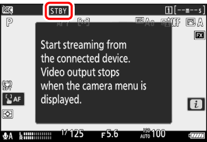 - Prikaz načina snemanja videoposnetkov se bo prikazal ne glede na nastavitev izbirnika fotografij/videoposnetkov. Za pretakanje slike bodo uporabljene nastavitve načina videa, vključno z ravnovesjem beline in Picture Control .