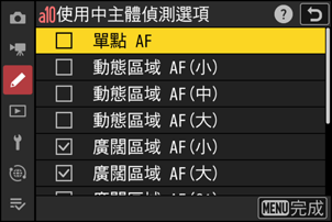 • 反白顯示選項並按下 J2 確定選擇(M)或取消選擇(U)。在自動對焦模式下,僅當選擇了帶有核選(M)標記的 AF 區域模式時才會啟用主體偵測。
