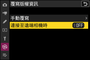 現在,將遙控相機連接至主要相機後,會使用主要相機上儲存的版權資訊自動覆寫遙控相機上的版權資訊。透過選擇主要相機網路選單中的 [連接至其他相機] > [覆寫版權資訊] 可啟用覆寫。