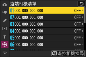 進入主要相機中的 [連接至其他相機] > [群組設定] >(群組顯示名稱),反白顯示 [遠端相機清單] 並按下 2。