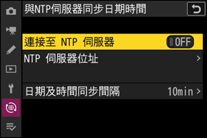 | [連接至 NTP 伺服器] | 選擇 [ON] 可將相機連接至 NTP 伺服器並同步其日期和時間。 |