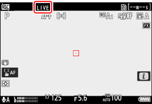- Дисплеят за видео режим на снимане ще се появи независимо от настройката на селектора за снимки/видео. Настройките на видео режима, включително баланс на бялото и Picture Control ще бъдат приложени към поточно предаваното изображение.