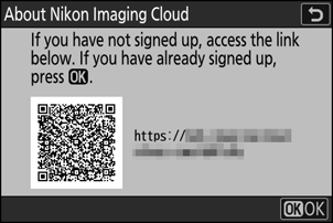 En QR-kode og URL vil blive vist for at gennemse Nikon Imaging Cloud fra webbrowseren på en computer eller smartenhed.