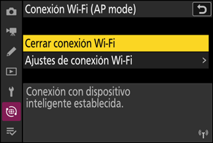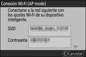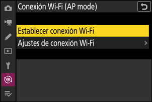 Cámara: Seleccione [Conectar con dispos. inteligente] > [Conexión Wi-Fi (AP mode)] en el menú de red y, a continuación, marque [Establecer conexión Wi-Fi] y pulse J.