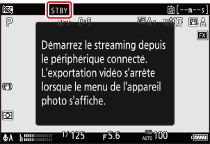 - L’appareil photo entre en mode veille et un message vous invitant à démarrer la diffusion et l’icône u s’affichent sur l’écran de prise de vue.