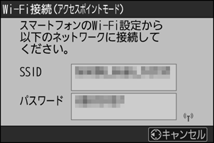 - スマートフォンとカメラのWi-Fi接続が完了すると、スマートフォンにWi-Fiアクセスポイントモード画面が表示されます。
