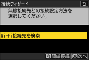 カメラ:[Wi-Fi接続先を検索]を選び、Jボタンを押す