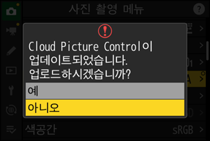 | [아니오] | Nikon Imaging Cloud에서 전송되어 카메라로 가져온 Picture Control은 카메라에 등록되지 않고 카메라가 메뉴로 돌아갑니다. 이 경우 사진 촬영 및 동영상 녹화 메뉴 탭과 카메라 메뉴의 [Picture Control 설정] 항목에 알림 표시가 나타납니다.