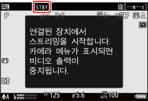 - 사진/동영상 셀렉터 설정에 관계없이 동영상 모드 촬영 화면이 나타납니다. 화이트 밸런스와 Picture Control을 포함한 동영상 모드 설정이 스트리밍 이미지에 적용됩니다.
