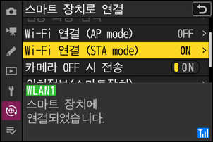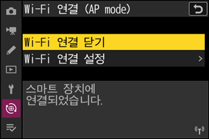 카메라: 네트워크 메뉴의 [스마트 장치로 연결] > [Wi-Fi 연결 (AP mode)]을 선택한 다음 [Wi-Fi 연결됨]을 선택하고 J를 누릅니다.