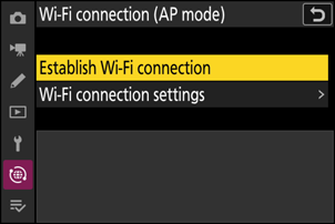 Câmera: Selecione [Conectar ao dispositivo inteligente] > [ Conexão Wi-Fi (modo AP) ] no menu de rede, depois realce [ Estabelecer conexão Wi-Fi ] e pressione J