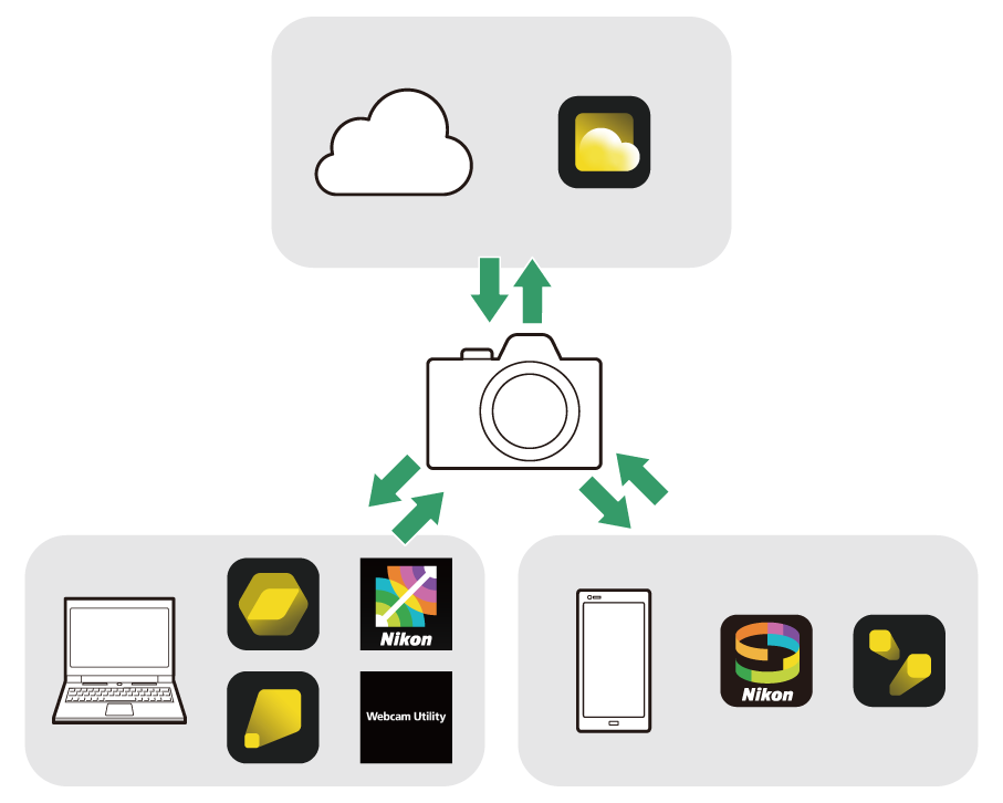 Nikon a pregătit un serviciu cloud, software pentru computer, aplicații pentru dispozitive inteligente și alt conținut pentru ca dumneavoastră să vă puteți bucura în continuare de fotografii. Utilizând acest conținut, puteți partaja setările camerei legate de finisarea fotografiilor pe care doriți să le realizați, puteți ajusta și procesa fotografiile pe care le-ați realizat, puteți transfera automat fotografii pe computere și dispozitive inteligente și multe altele.