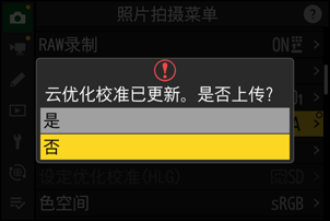 | [是] | 将照相机连接到尼康云创时,优化校准会从尼康云创发送并导入照相机。这些导入的优化校准还不会在照相机上显示。选择[是]可将导入的优化校准注册到照相机,并将它们添加至[设定优化校准]列表。 |