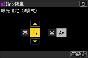 - 若要设定主副指令拨盘的功能,请在[曝光设定]对话框中选择模式M并按下DISP。
