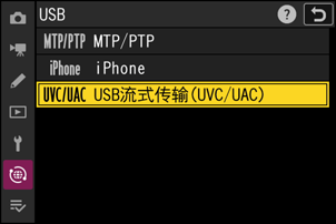 照相机:在网络菜单中选择[USB],加亮显示[USB流式传输(UVC/UAC)]并按下J。