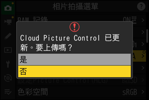 | [否] | 從 Nikon Imaging Cloud 傳送並匯入相機的 Picture Control 不會註冊到相機;而相機會返回選單畫面。在此情況下,相片拍攝選單和短片記錄選單標籤上以及相機選單的 [設定 Picture Control] 項目上將出現通知標記。