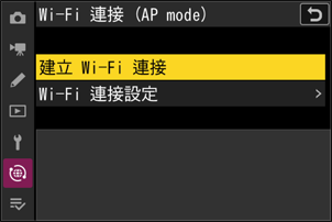 相機:在網路選單中選擇 [連接至智慧型裝置] > [Wi-Fi 連接(AP mode)],然後反白顯示 [建立 Wi-Fi 連接] 並按下 J。