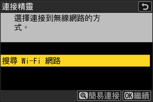 相機:反白顯示 [搜尋 Wi-Fi 網路] 並按下 J。