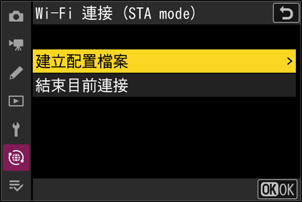 相機:在網路選單中選擇 [連接至智慧型裝置] > [Wi-Fi 連接(STA mode)],然後反白顯示 [建立配置檔案] 並按下 J。